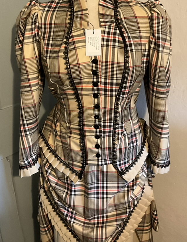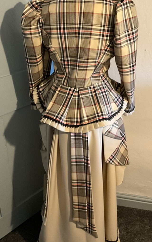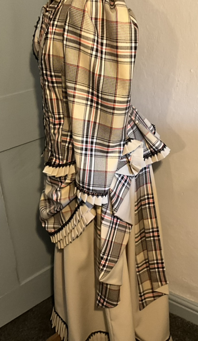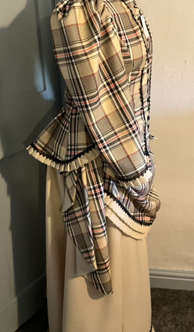 The over bustle was made from cream and brown brushed tartan cotton with cream contrasting hand pleat work and a button fastening