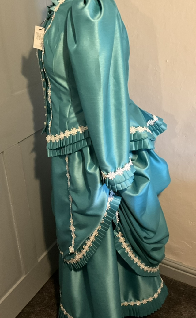 The over bustle was made with turquoise shot silk trimmed with cream lace contrasting hand pleat work and a button fastening