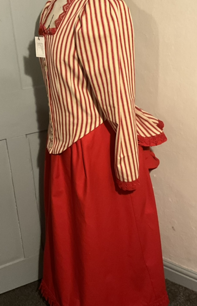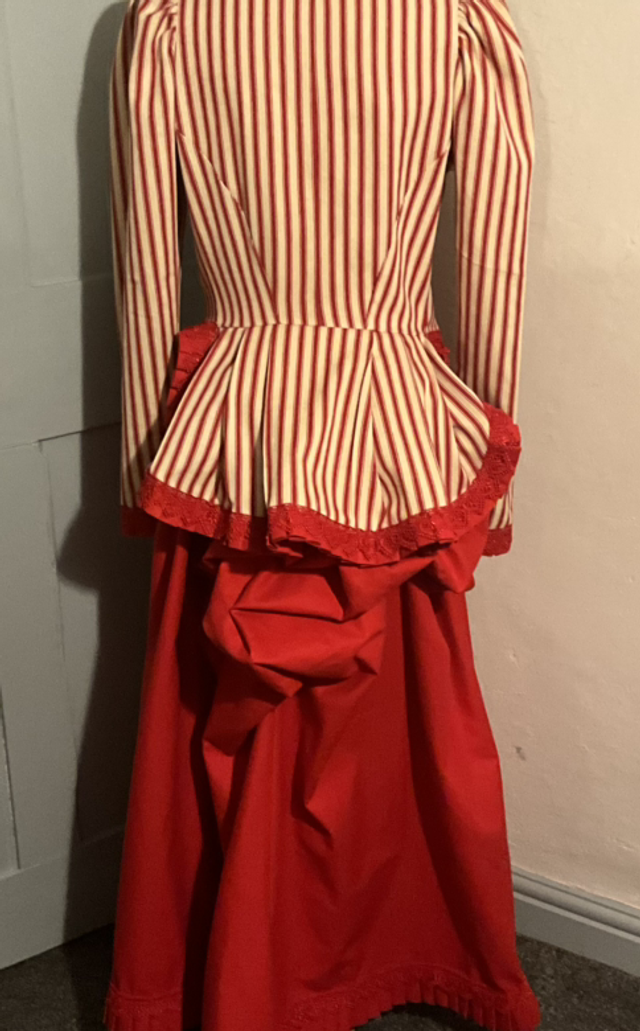 The bustle skirt is made from solid red cotton drill with buttoned waistband and hand pleatwork around the bottom of skirt