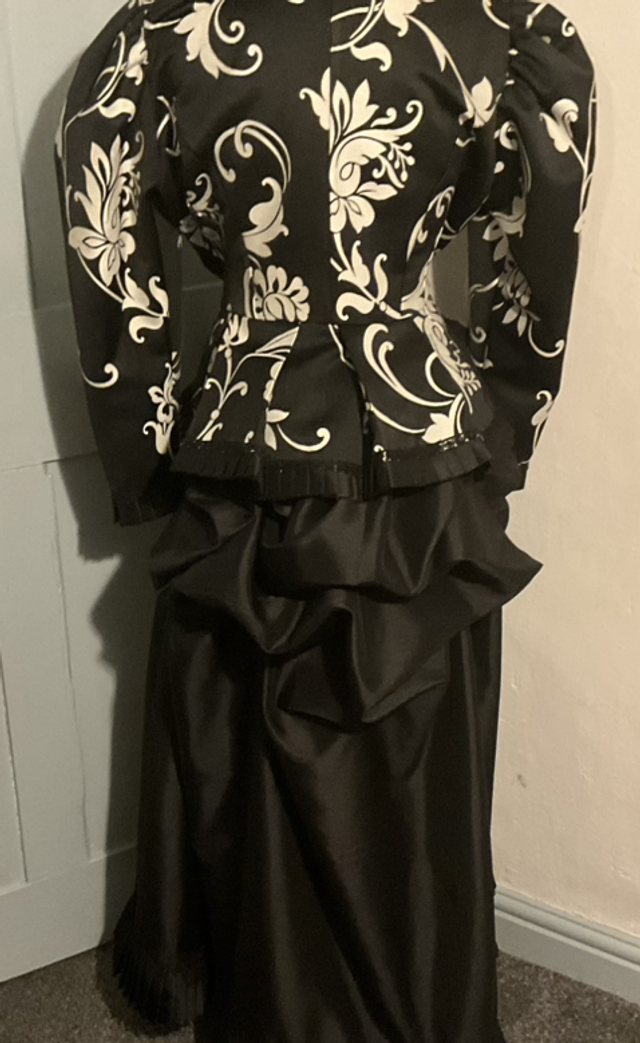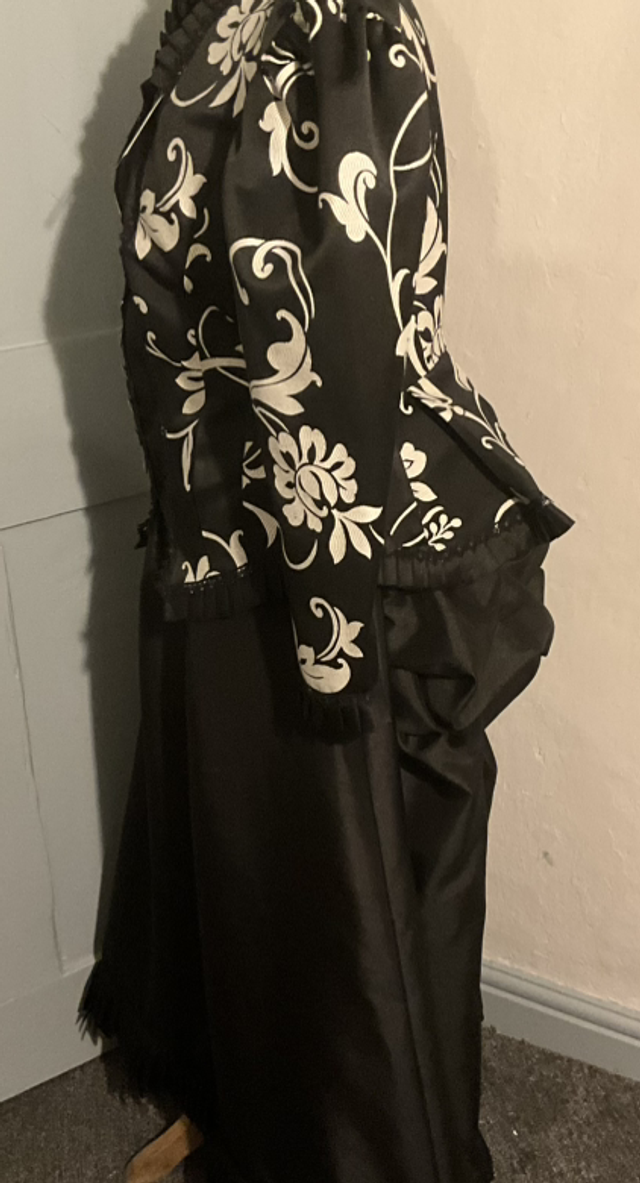 The Bustle skirt was made from black shot silk buttoned waistband and hand pleatwork round the bottom of the skirt