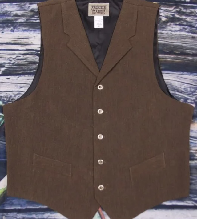 Frontier classics maverick brown vest fully lined with adjustable back strap There are 2 front pockets Approx Chest Sizes Medium - 40 to 42 Chest Large - 42 to 44 Chest XLarge - 44 to 46 Chest XXL - 48 to 50 Chest Out of stock items will be placed on back order for you and shipped when they are available