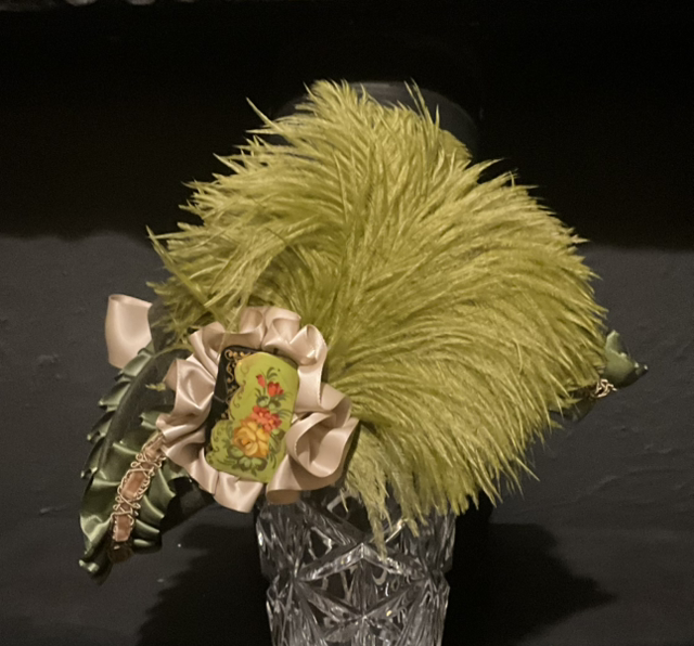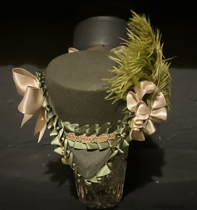 wool based hat trimmed with contrasting feathers and trimmings