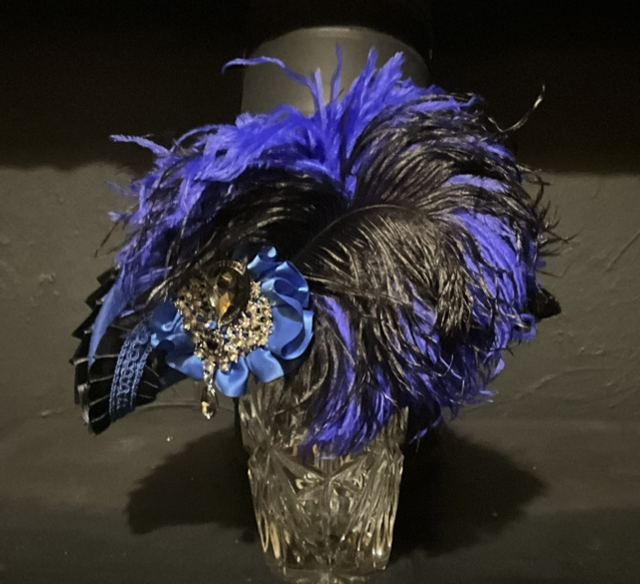 wool based hat trimmed with contrasting feathers and trimmings