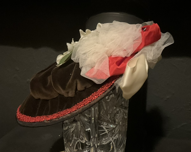 buckram based hat covered with brown velvet and lavished with contrasting decorative trim