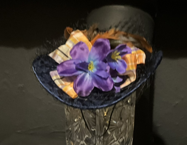 buckram based hat covered with navy brocade fabric and lavished with contrasting trimmings