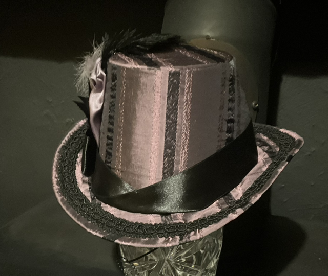 buckram based hat covered with aubergine and black fabric lavished with contrasting trim