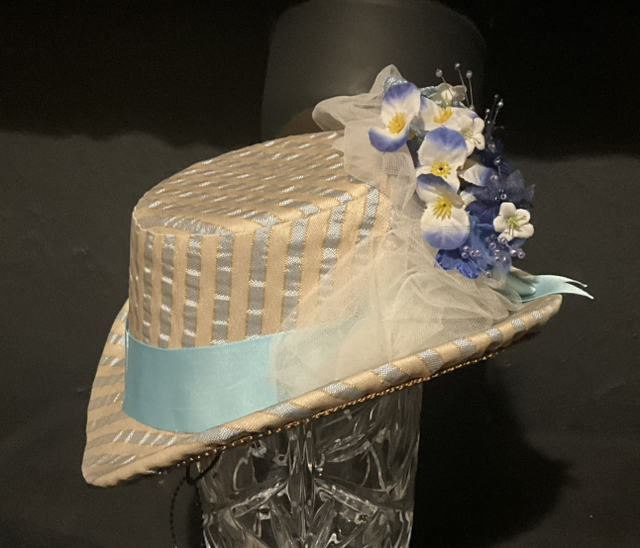buckram based hat covered with beige and blue stripe fabric trimmed with contrasting flowers